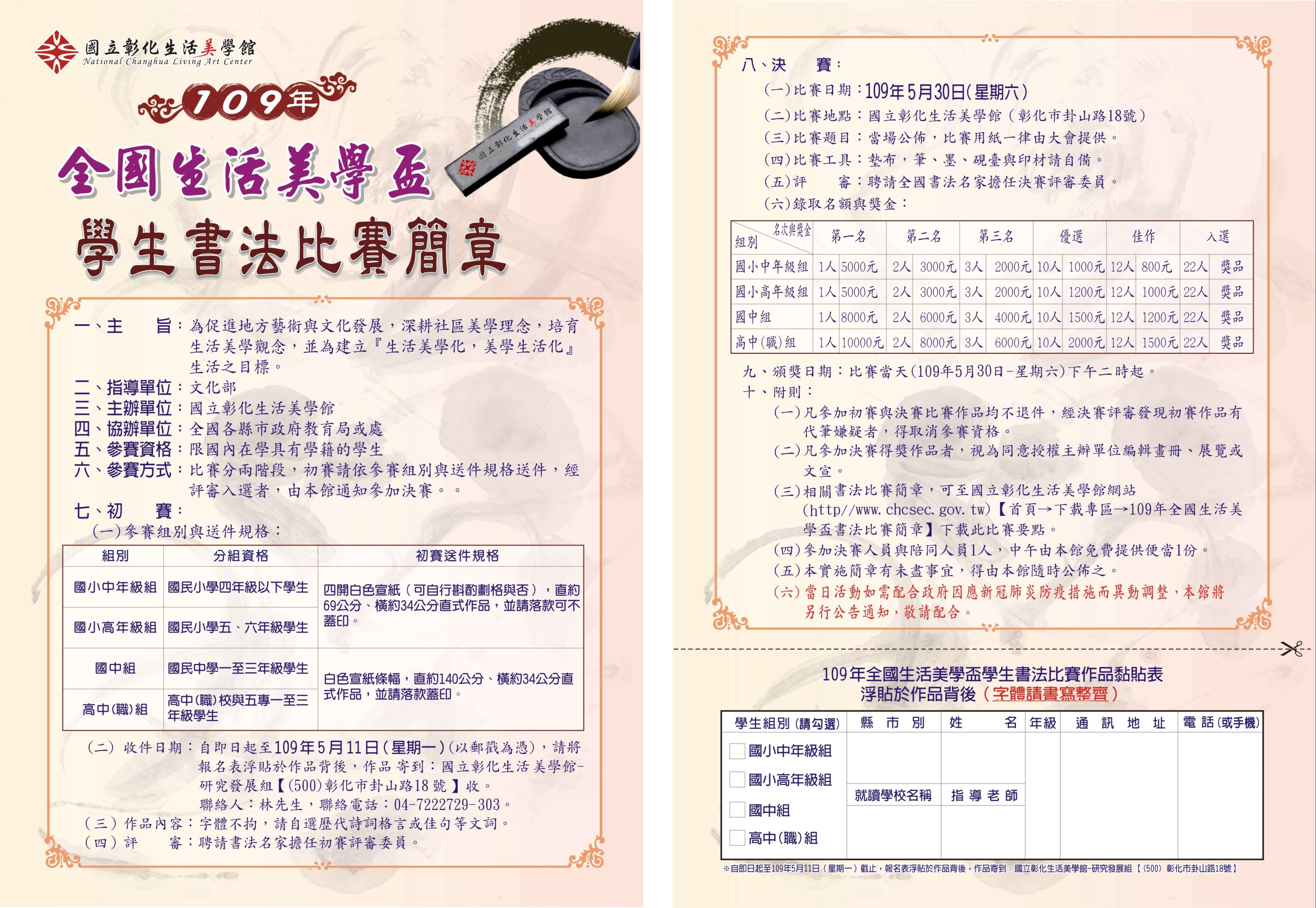 主旨:國立彰化生活美學館主辦「109年全國生活美學盃學生書法比賽」,請鼓勵學生踴躍報名參加,請查照。