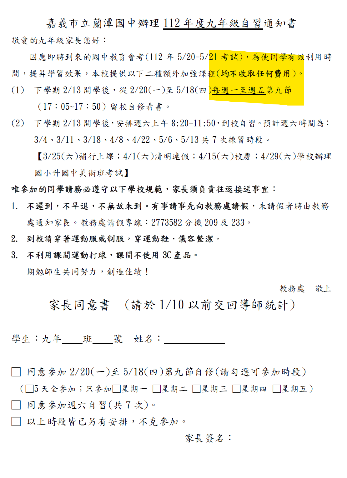 1. 附件-留校自習(未收費)--家長通知書有標註。