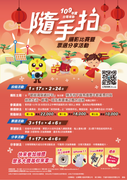 轉知:台灣電力股份有限公司自109年1月17日至109年2月24日止 辦理「台電綠動隨手拍攝影比賽暨票選分享活動」,歡迎 有興趣者踴躍參加~