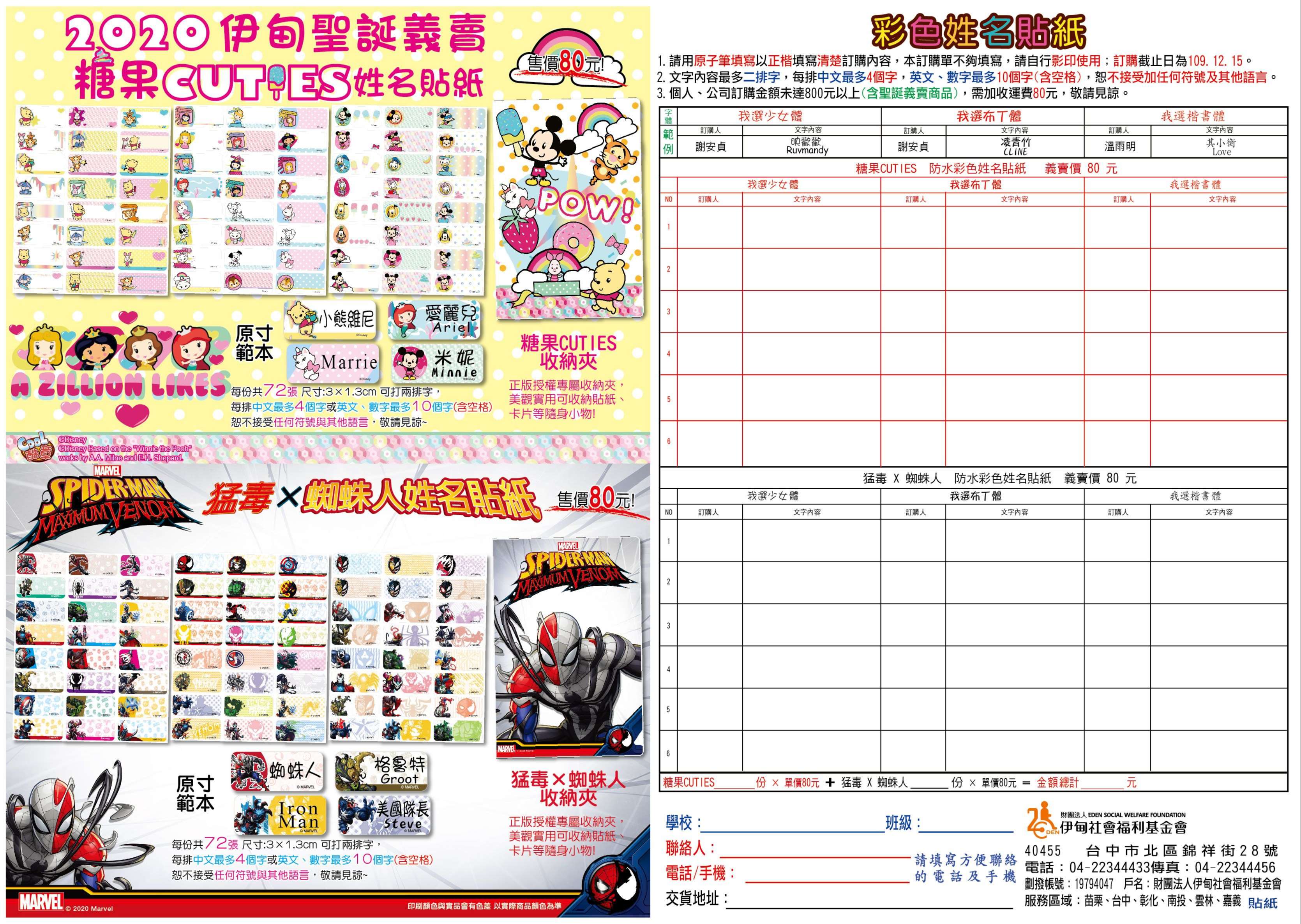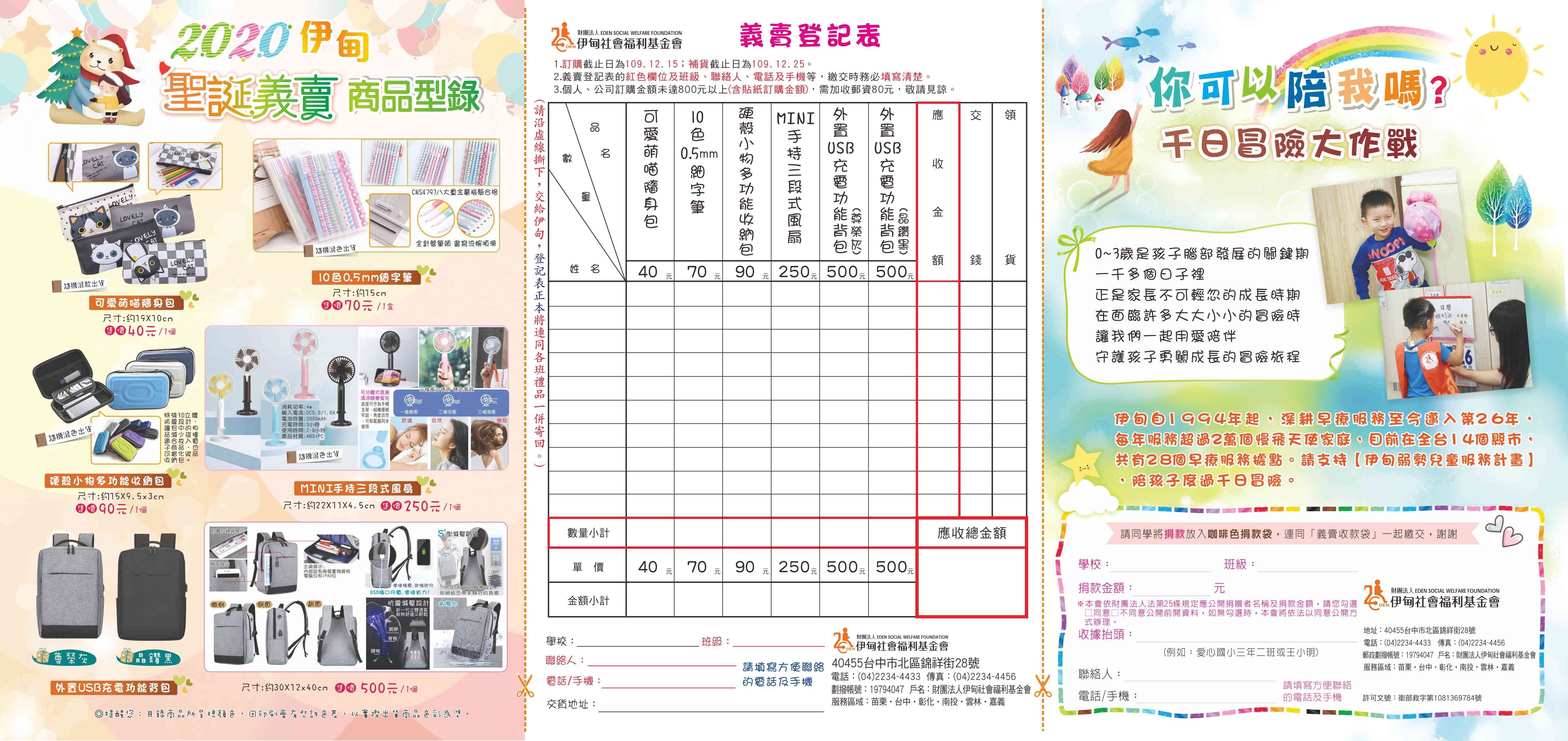 財團法人伊甸社會福利基金會為籌募「弱勢失能家庭服務」經費,特舉辦「伊甸109年聖誕義賣」義賣活動,請親師生踴躍參與。