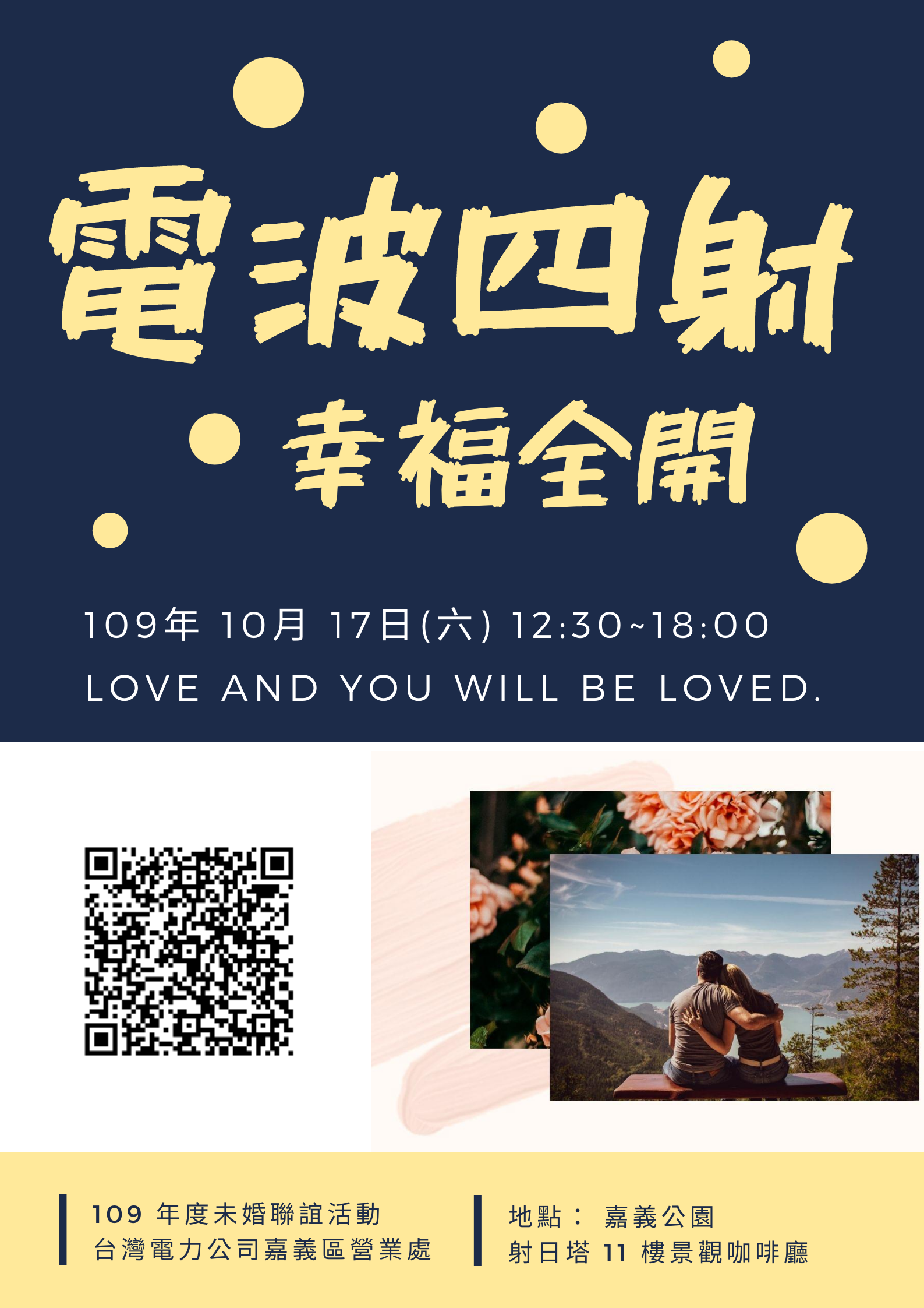 台灣電力股份有限公司嘉義區營業處109年度「電波四射,幸福全開」未婚聯誼活 動,請單身同仁踴躍報名參加。