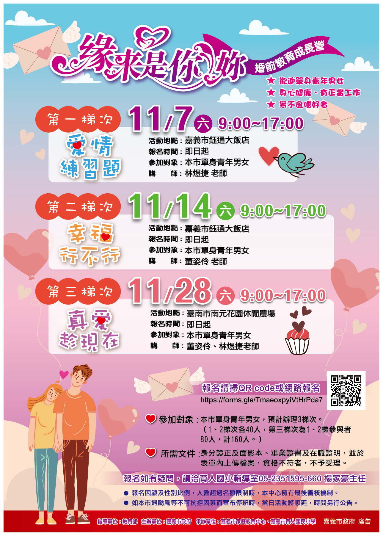 嘉義市109年度「緣來是你/妳~婚前教育成長營」(交友篇)活動,鼓勵本校未婚同仁踴躍報名參加。
