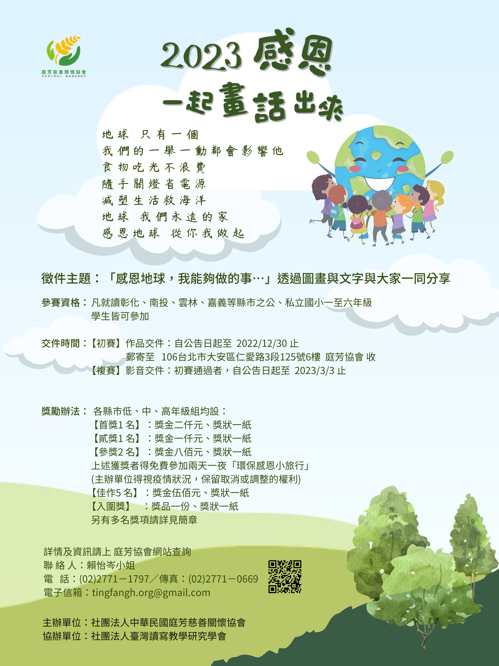 旨:函轉財團法人中華民國庭芳慈善關懷協會推行感恩品格教育,自10月1日起舉辦「2023庭芳感恩一起畫(話)出來-感恩地球,我能夠做的事...」圖文創作徵件活動,請貴校鼓勵學生踴躍參賽,請查照。