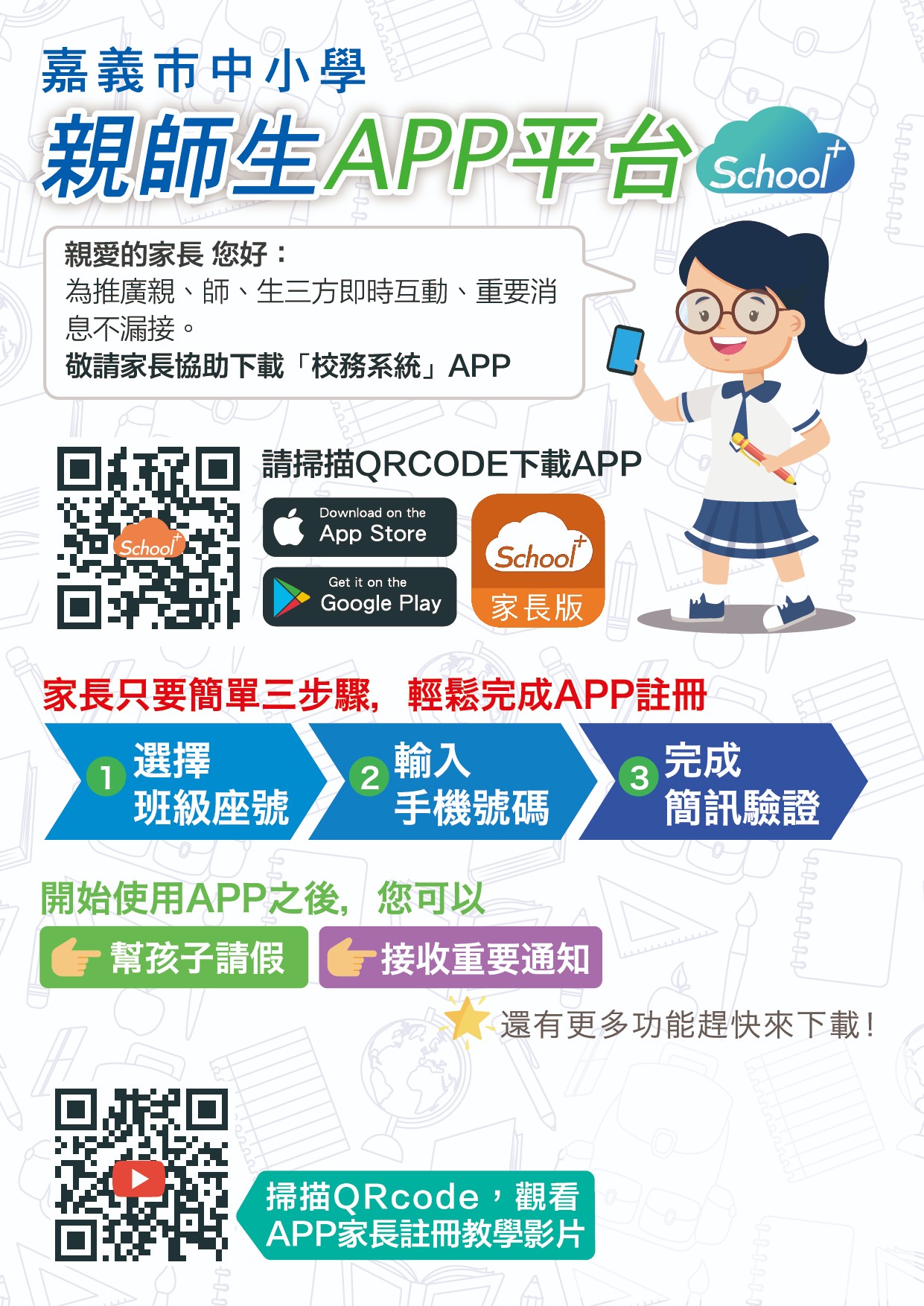 親愛的家長您好,為推廣親、師、生三方即時互動、重要消息不漏接, 請依下圖說明在您的手機下載「校務系統」APP,詳細操作方式及功能說明請點選頁面下方相關附件。