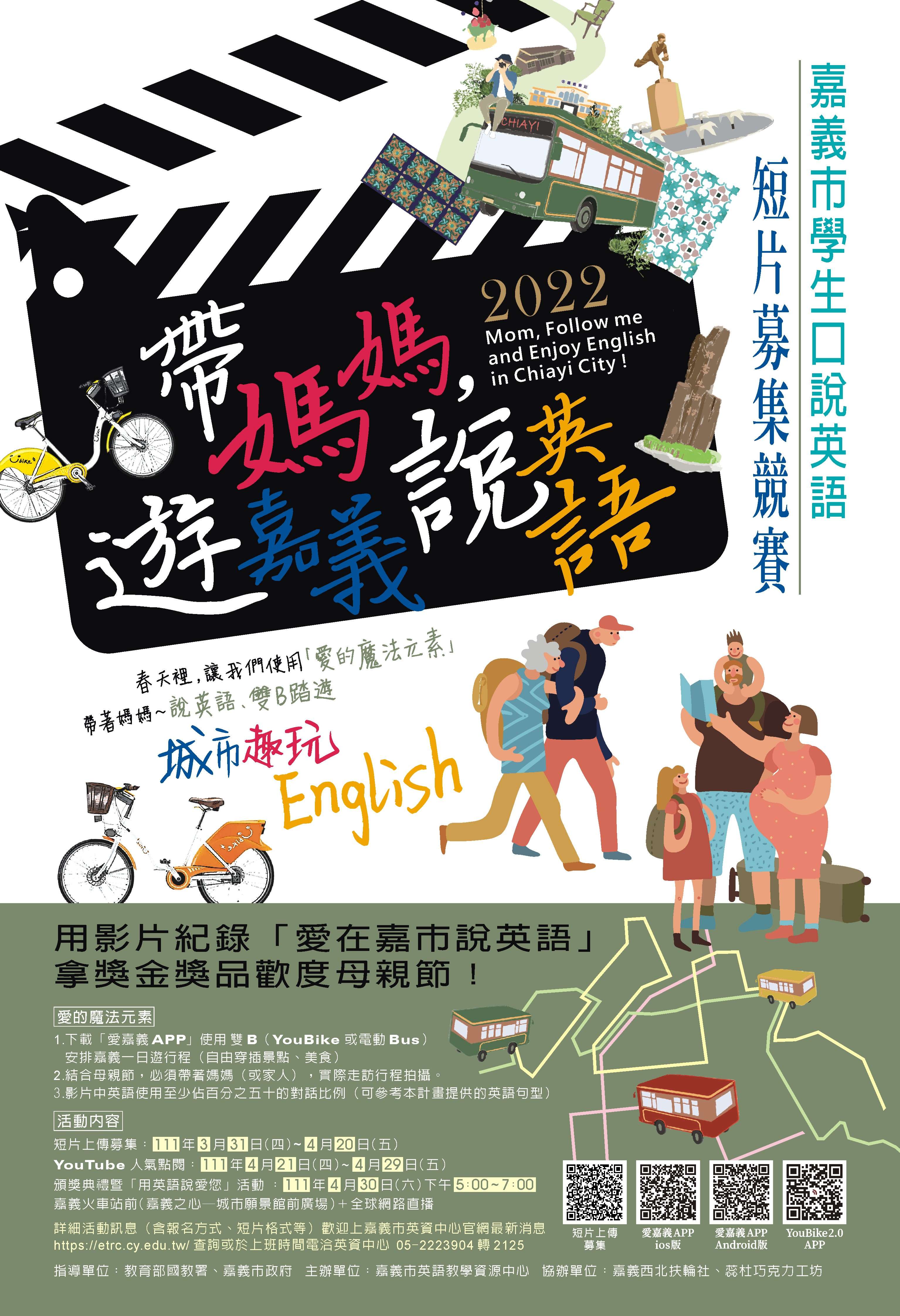 二、檢附「2022嘉義市學生口說英語短片募集競賽計畫」之競賽內容、活動海報、參考英語對話與句型,請學校協助宣導,亦歡迎結合學校之母親節活動辦理。