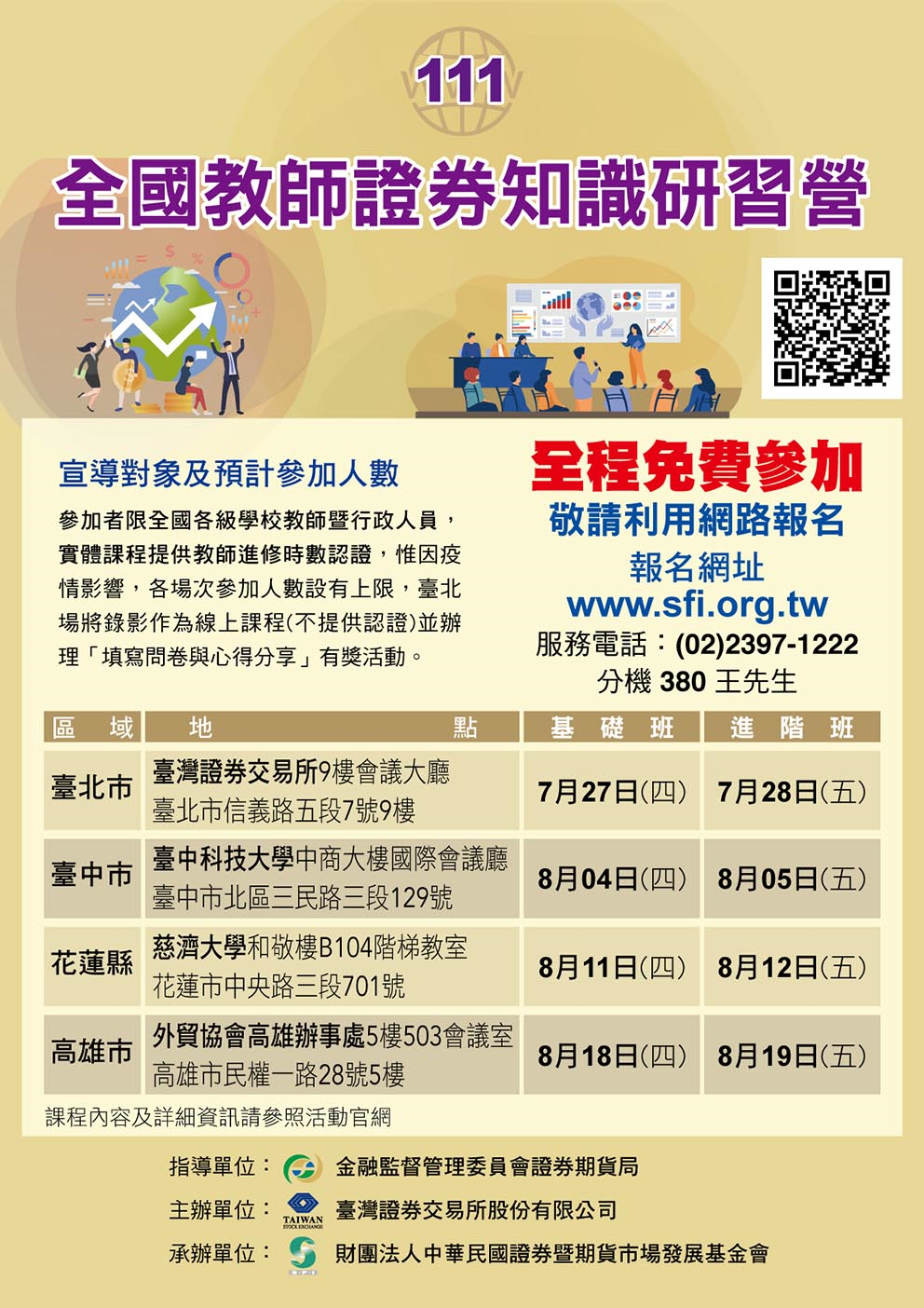 三、本活動完全免費,教師參與本活動可獲得「教師研習時數」認證,為使知悉本活動內容,該基金會已於網站首頁設立「全國教師證券知識研習營」專區,網址為https://webline.sfi.org.tw/workshop/Default.asp?csn=578,即日起至8月15日止,請有興趣之教師暨行政人員於網站上報名參加。
