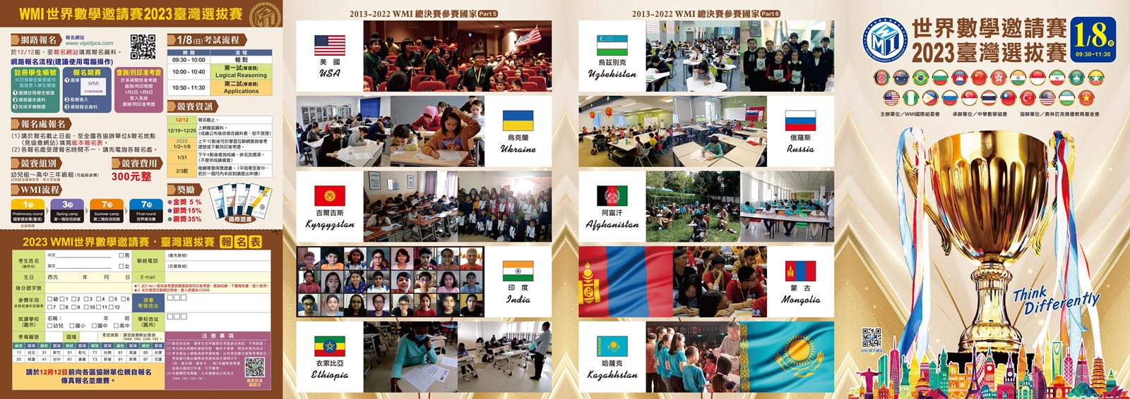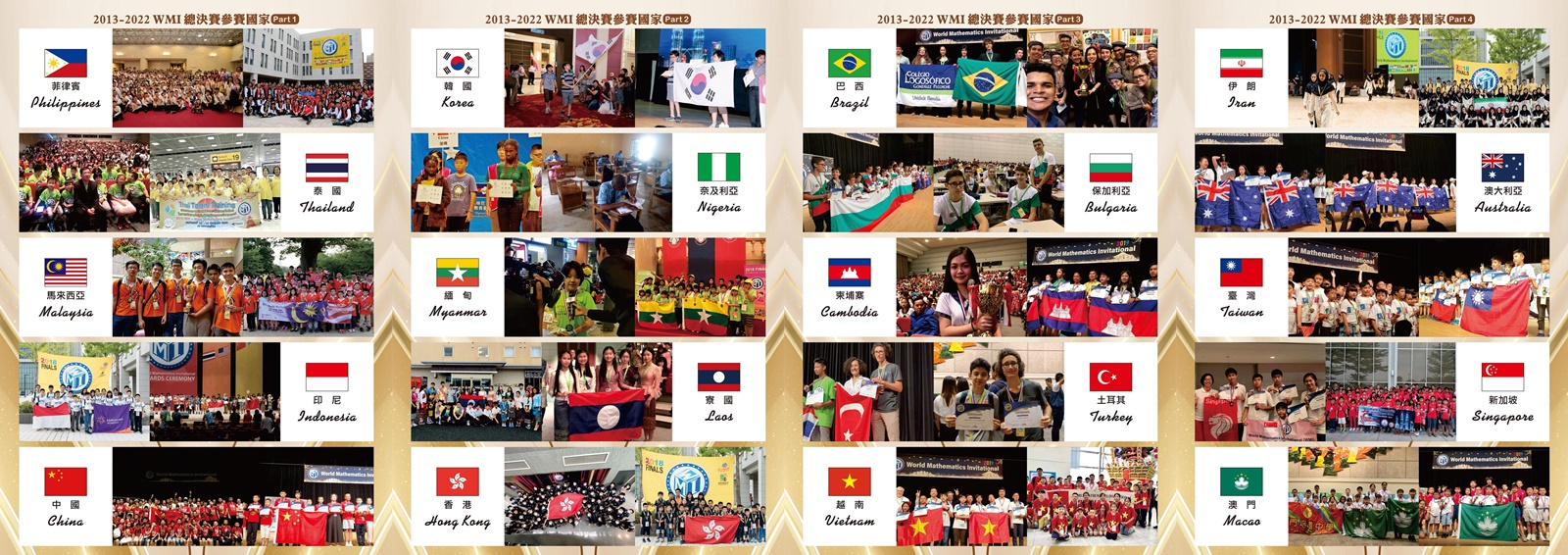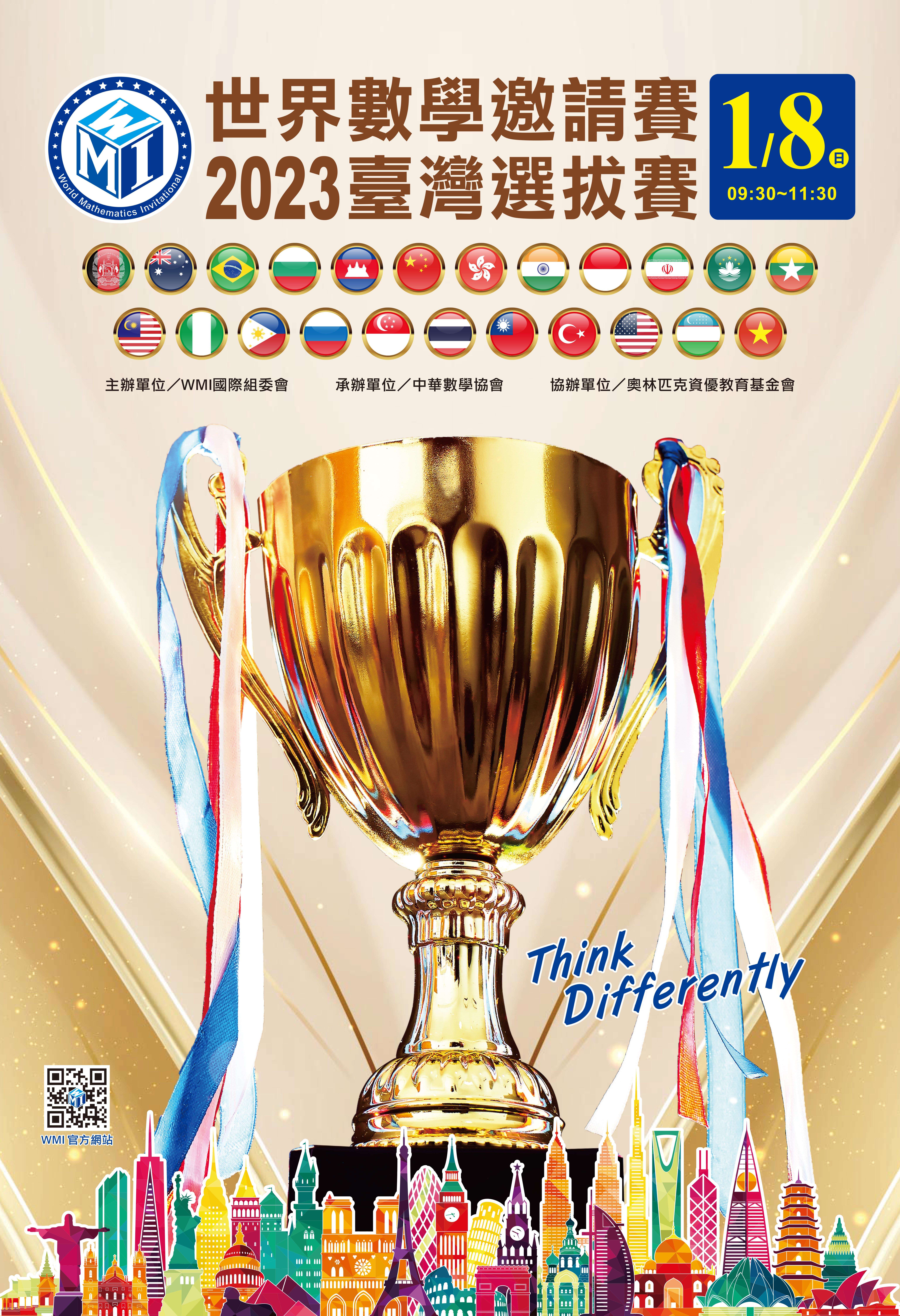 二、WMI 世界數學邀請賽為第一個由台灣發起舉辦的國際性數學競賽,集合世界各地致力於數學推廣組織機構,每年將在不同國舉辦。